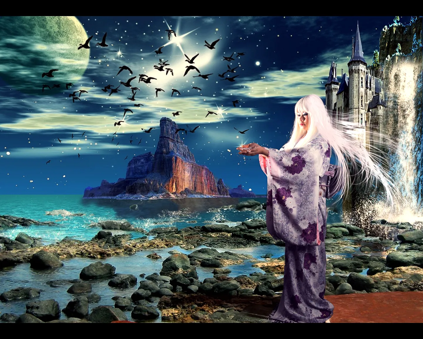 1.就原图来讲,只有人物面部打了强光,如果硬改的话,效果不会很理想,所以你这点是对的,保留原效果。既然面部有了强光,那么我觉得手里应该捧一个能够发出强光的物体,比如光球,发光的精灵,发光的鸟之类,而不是星光点点,逻辑上那么点的光没法把脸照得那么亮。