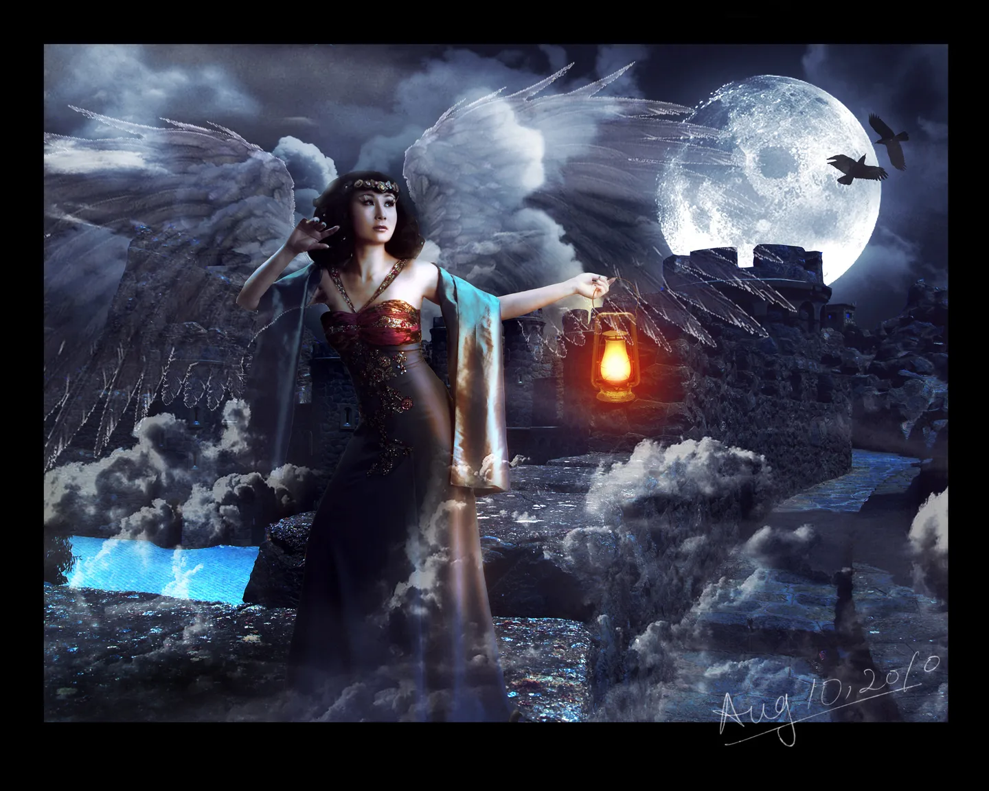 意境不错,就是笔刷和透明的应用不是很恰当导致构图有点乱,建议去掉翅膀,气雾可以用云彩效果代替,笔刷还是太生硬了。
