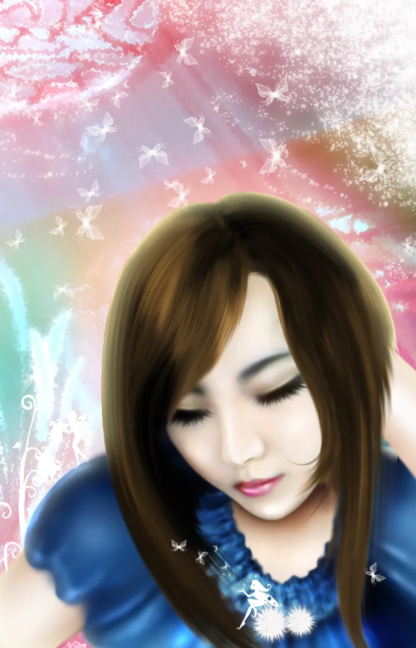 背景:朦胧化 基调:典雅唯美 最好换成长头发,梦幻一点,还有把鼻子弄高点 和把睫毛弄长点 呵 呵 谢 啦
