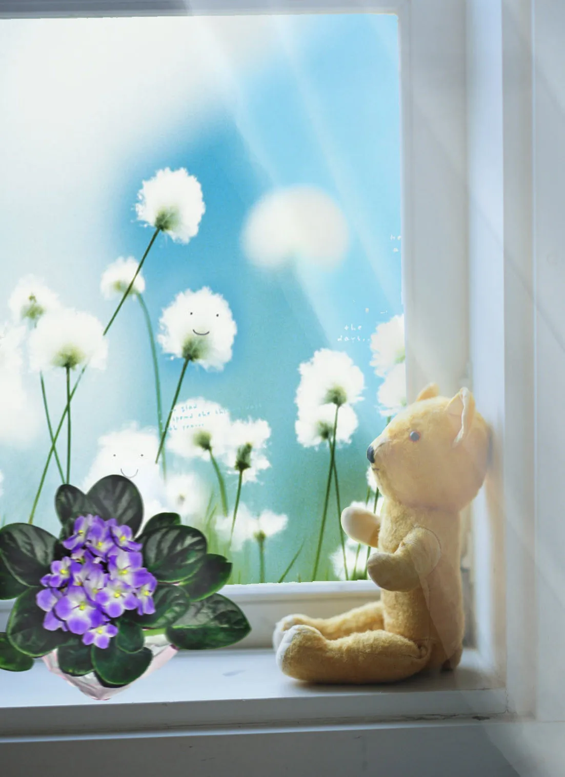 想刷圖一下,換一個背景:花倚在窗台上,薄薄的窗纱被風輕輕吹起,窗外,寧靜的郊外景色