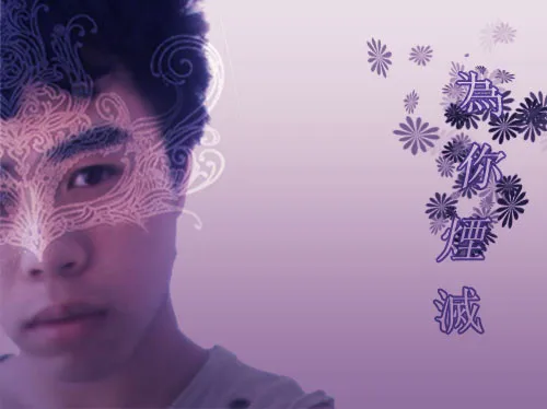 调色,在脸上加参考图面具,要半透明的感觉 把背景去掉,在背景延展的部分加文字(為你煙滅
