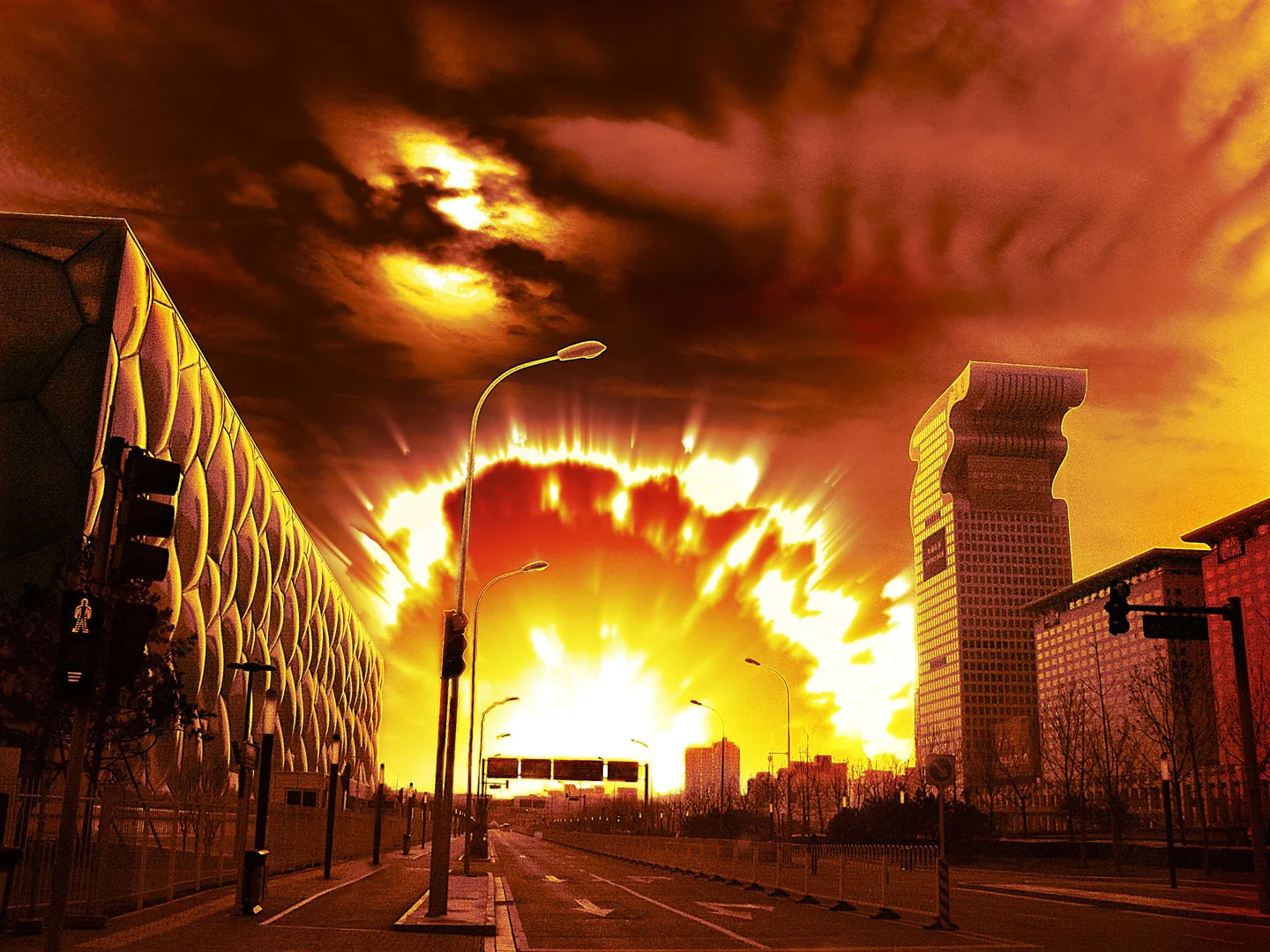 路灯以及大厦的阴影应该加深!路灯大厦都属于逆光!你现在的效果看起来跟底图爆炸效果不符合!