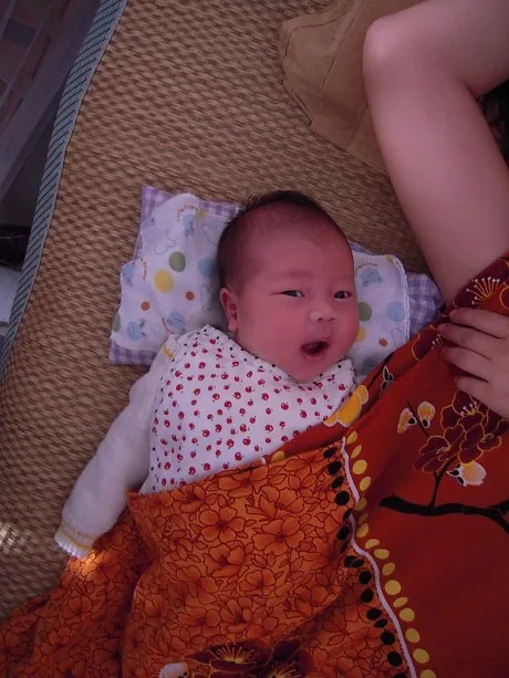 想把这张照片美好后框起来送给小外甥女作为满月的纪念,希望朝着活泼、快乐、明亮的方向去美化这张照片,给人物换一个好看的背景,把那只手也去掉。非常感谢~ 用途:家庭纪念 基调:欢悦明快的 艺术化:轻微艺术化