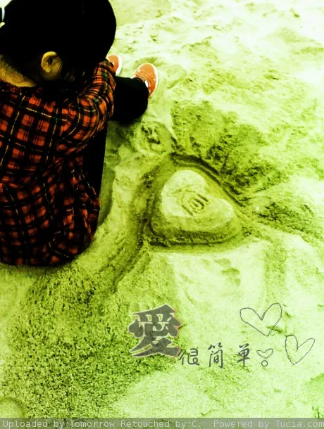 昨天去游玩。他有事去不了。 在海边的沙滩上。 阳光。海浪。突然很想他。 突出主人公和地上的桃心(当然包括上面的那字.那字是“烜”) 基调:典雅唯美 用途:爱情纪念 艺术化:轻微艺术化 然后。就怎么好看怎么弄啦~嘿。 小女子在此先谢过。谢谢谢谢谢谢谢谢谢~!