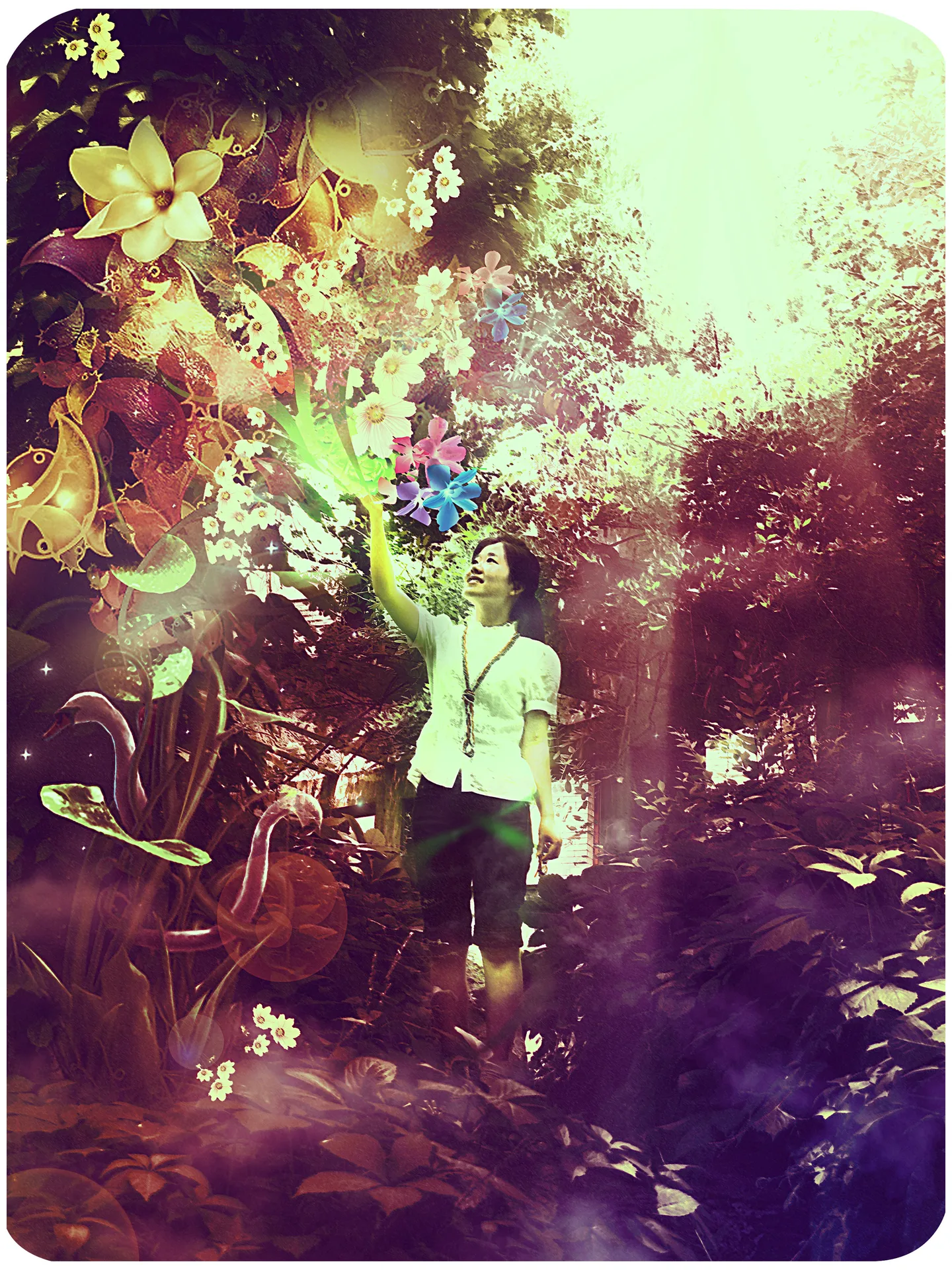 哦哦 大概是 我本来颜色是 绿色的主调 后来觉得不够神秘 就整体调了一下 人物没有过多修饰 当时觉得 人物应该像自己发光发亮的感觉 我本人是比较喜欢人物手臂上的亮度 感觉很漂亮 不过被你这么一说 好像人物整体是绿色的 是有点唐突了 谢谢交流~~