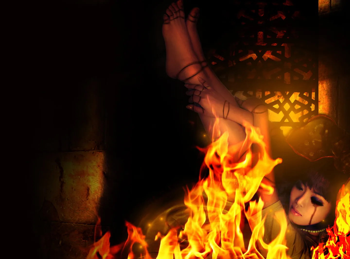 不错,不错!不过提个建议啊!头部的火焰重了,把人物盖住了,淡化一点比较好!脸上的泪痕用深红色会否好点呢?手脚的黑线是勒痕吗?