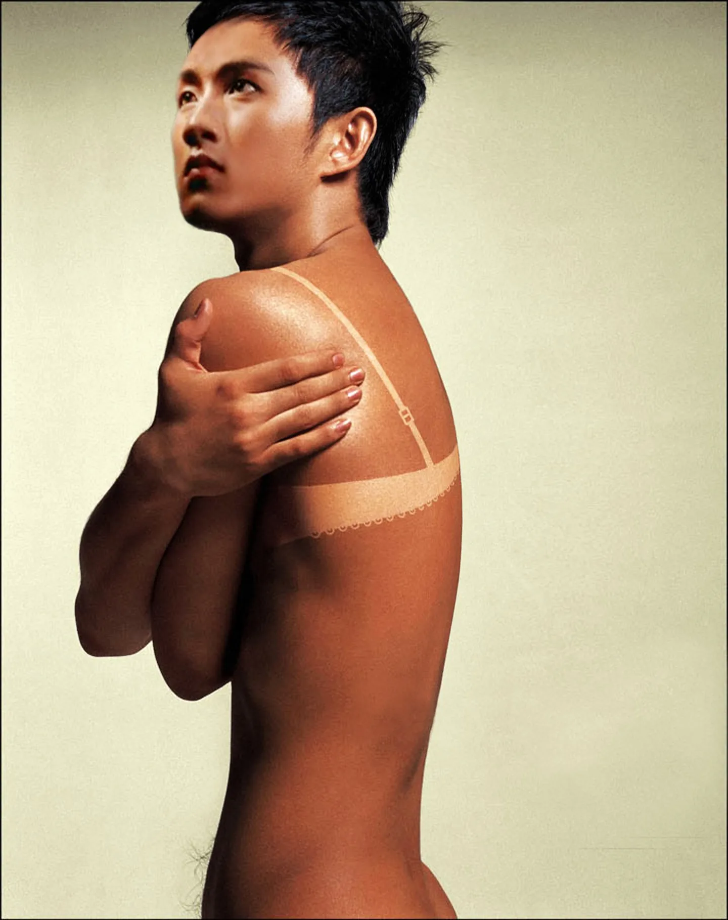 你应该在原图上直接给他戴上···或者是···用淡化画出一个内衣形状···