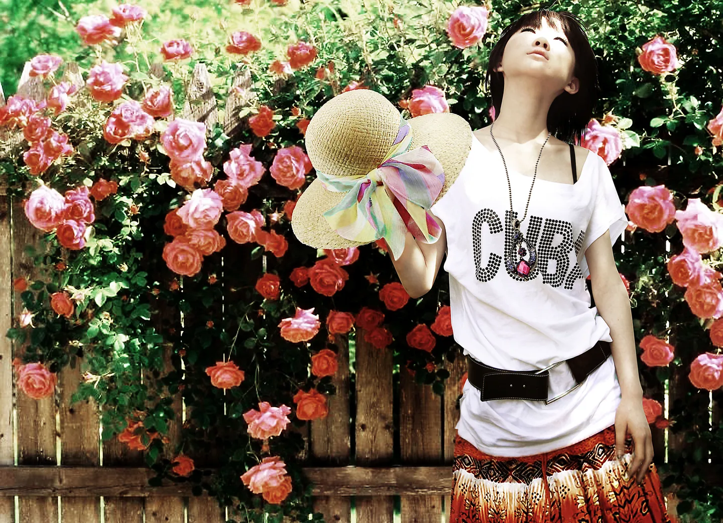 暖暖的阳光、鲜红的花朵、曼妙的少女。