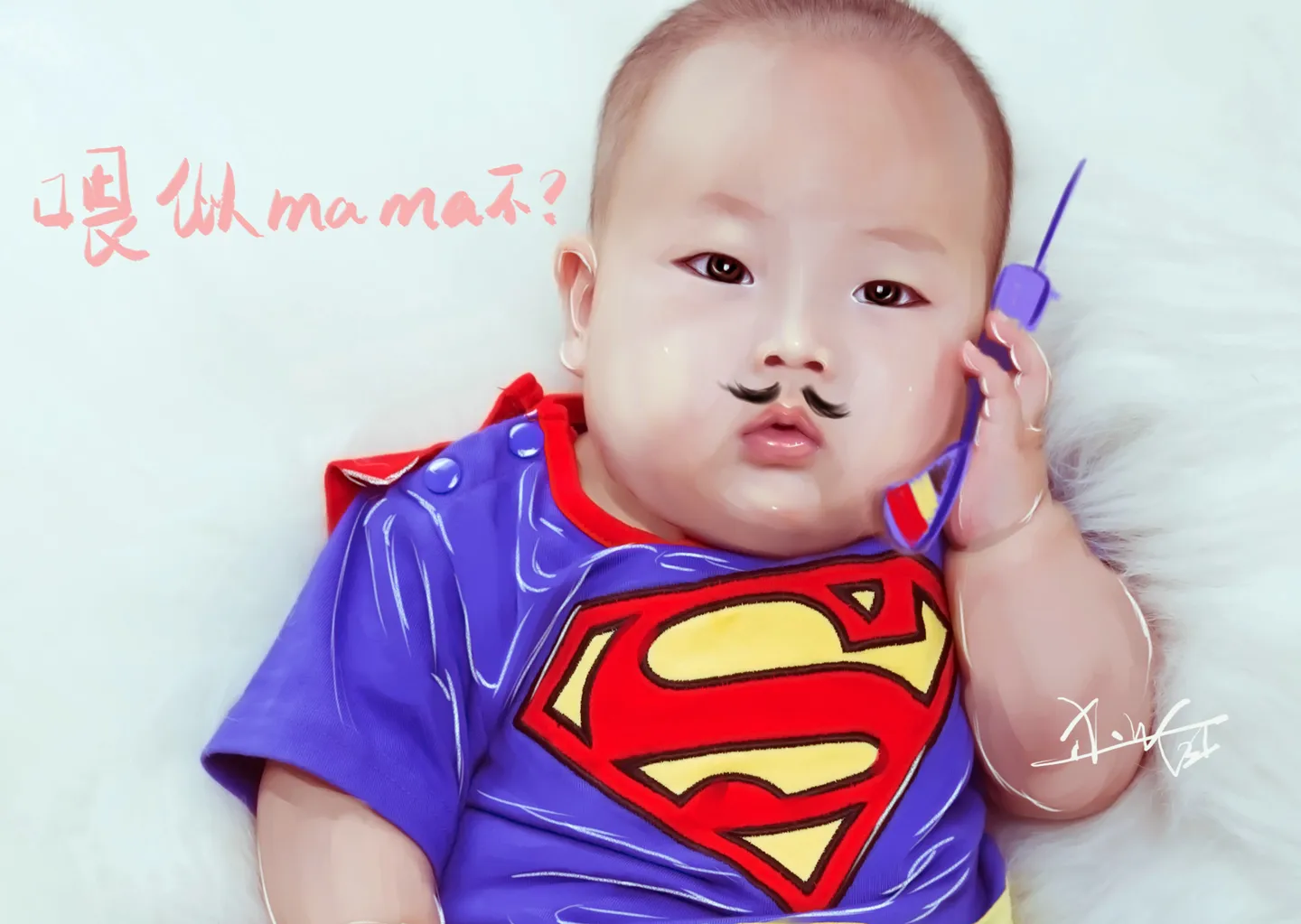 哈哈。。。这两撇小胡子太太太喜感了[[bre!ak]]超可爱啊[[bre!ak]]白白小超人的衣服画的超有质感的 褶皱的地方处理的好好