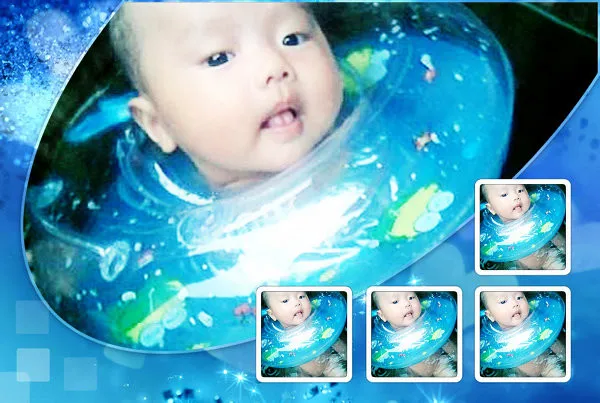 照片上是我刚满100天的侄子,手机照的,有点小,头顶缺了一点可能也不太好弄(戴个可爱的帽子?)你看着办啊,先谢了。话说我实在不怎么会P小孩的相片啊``` 用途:家庭纪念 基调:欢悦明快的