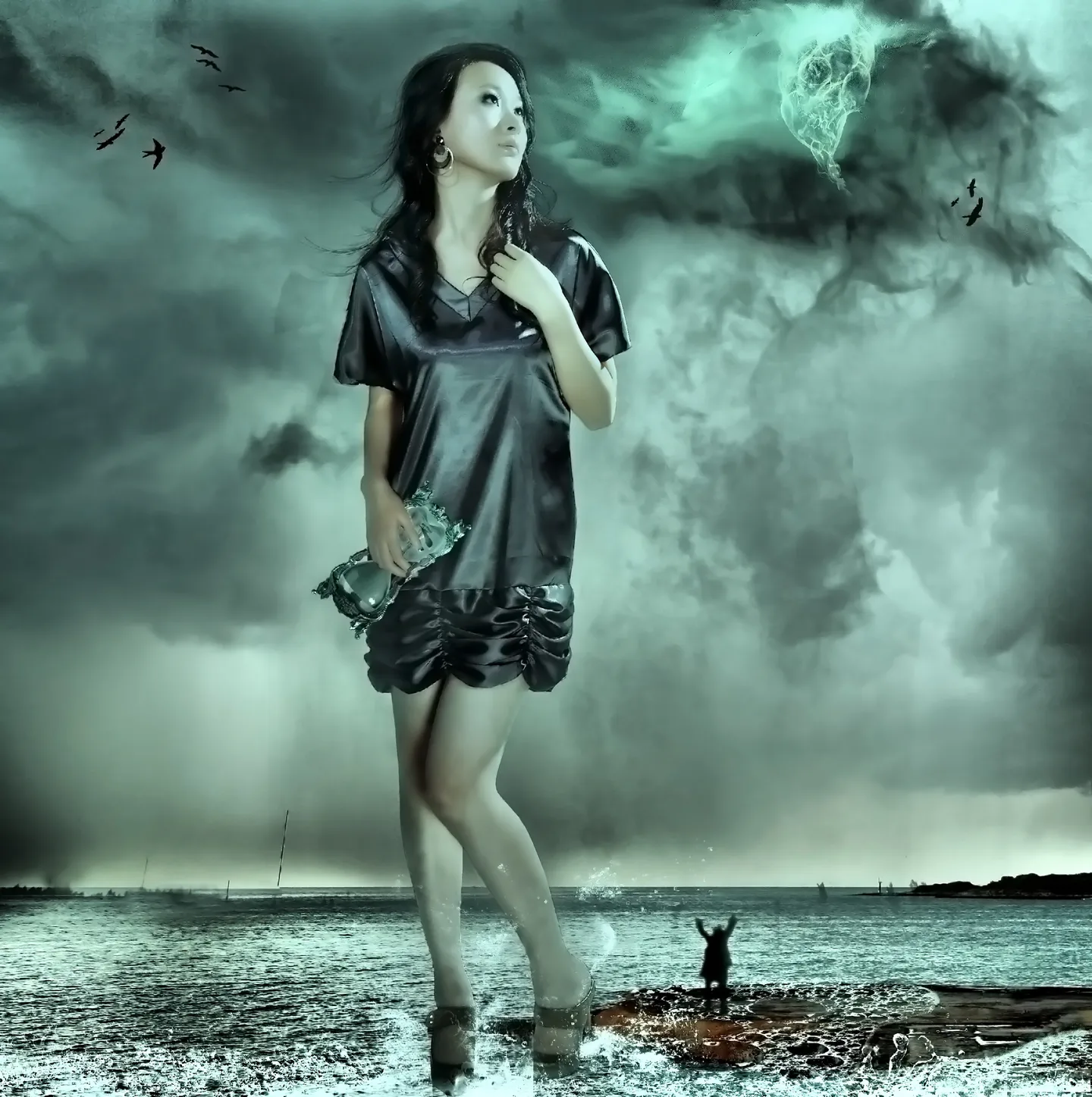 恩, 素材就3张, 无云彩的天空、海洋码头以及一张沙漏的素材,其余用笔刷,骷髅头雾气用骷髅素材叠加等模式混合雾气就可以得到,水溅用笔刷,然后调色,修复细节。~~~