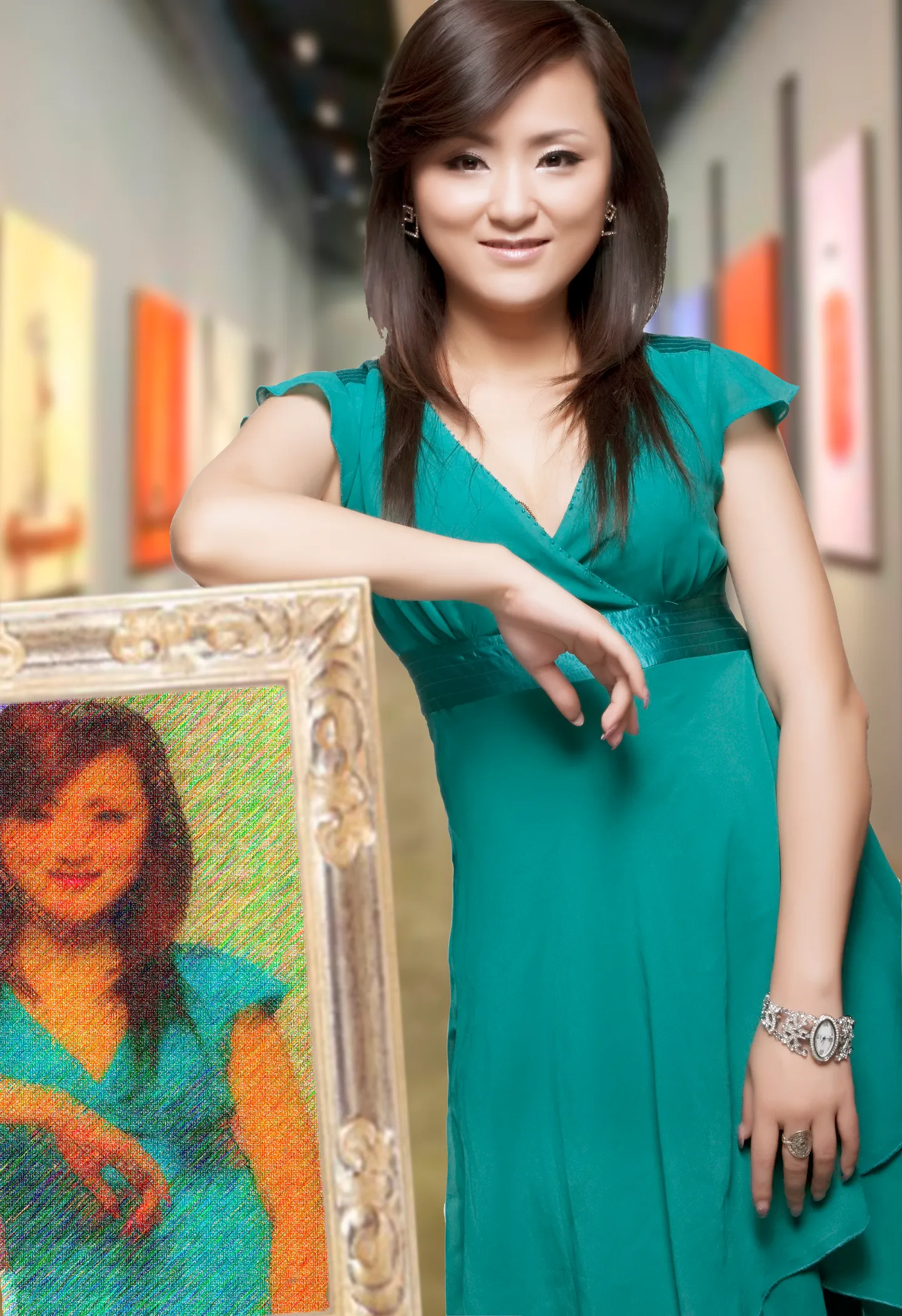 希望表达美女画家带着自己的自画像去参加画展。。。。。。。