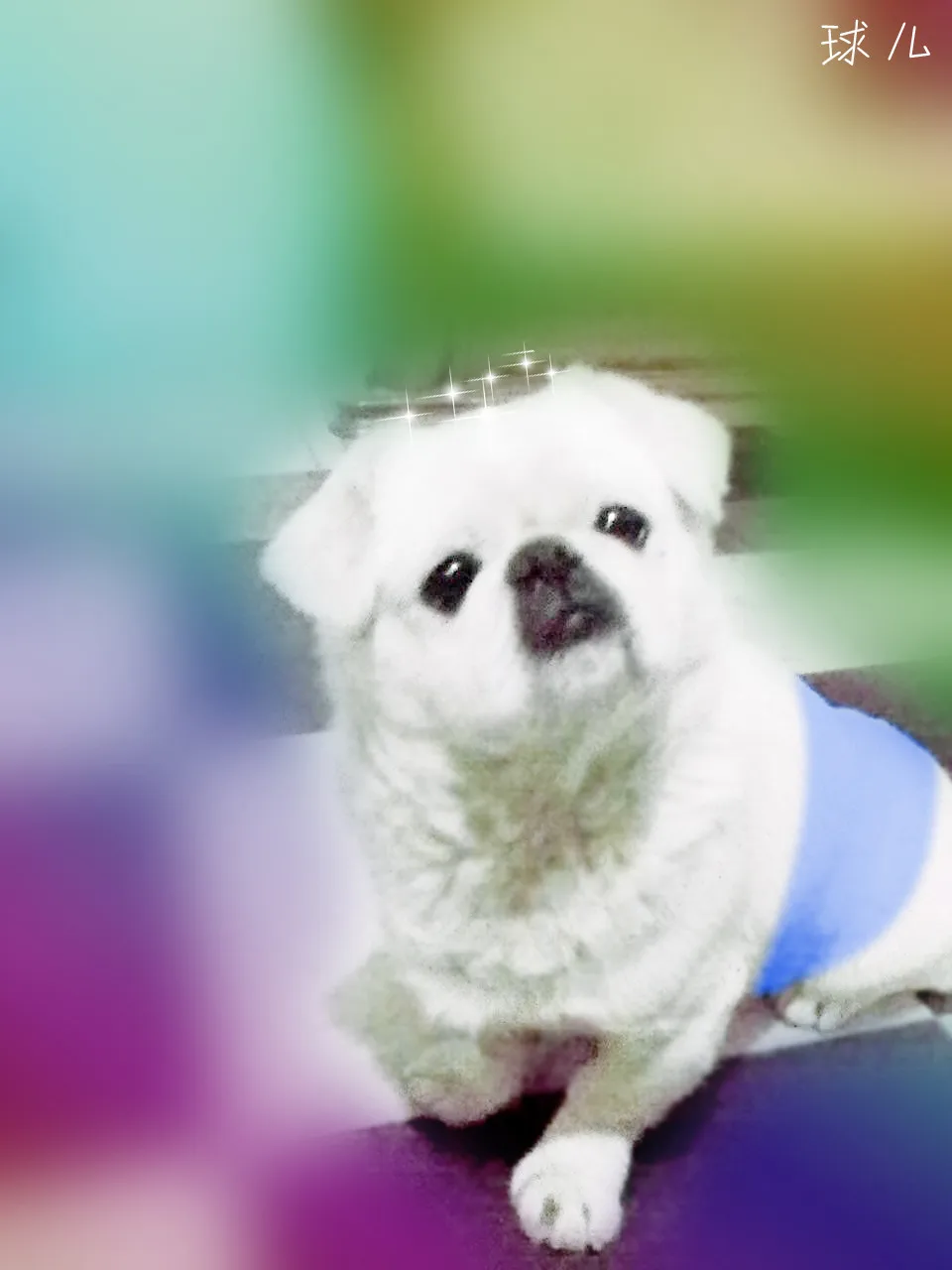 亲们,帮帮忙!谢谢!! 这是我们家的老三!马上就要十岁了!嘿嘿!!换个背景,给整件衣服之类的!!亲们觉得咋好看就咋整吧!!重点是我们老三是一只白色的狗狗,千万别改色啊!! 基调:欢悦明快的 艺术化:轻微艺术化