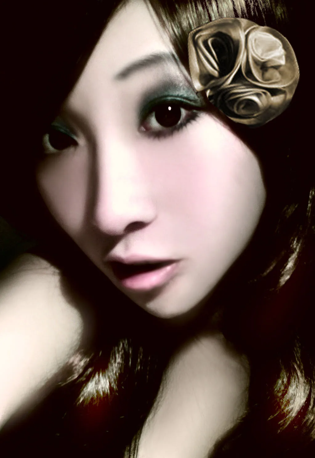 艺术化:轻微艺术化 睫毛刷长点,眉毛修一下,烟熏再重点,看起来妖艳一点呵~~ 给人物换一个好看的背景