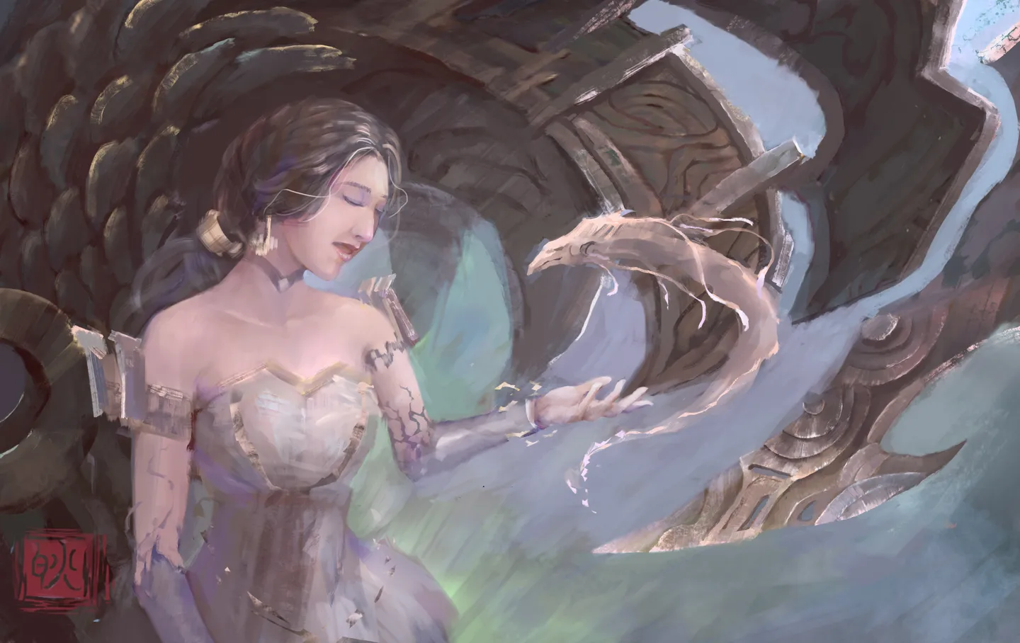 好像带电的么~~~~后面背景青铜器的质感画的好棒!其实我下载下来已经看到很多细节了~我还有金属护臂,发圈~耳饰~~~人物主体在整个环境里就很和谐~~~~喜欢鱼丸的图就是因为整体感每次都特别赞!用色也特别舒服~总之赶紧抱走欣赏了~~~哈哈~~~~话说,照顾好我口子啊~等你们回国~