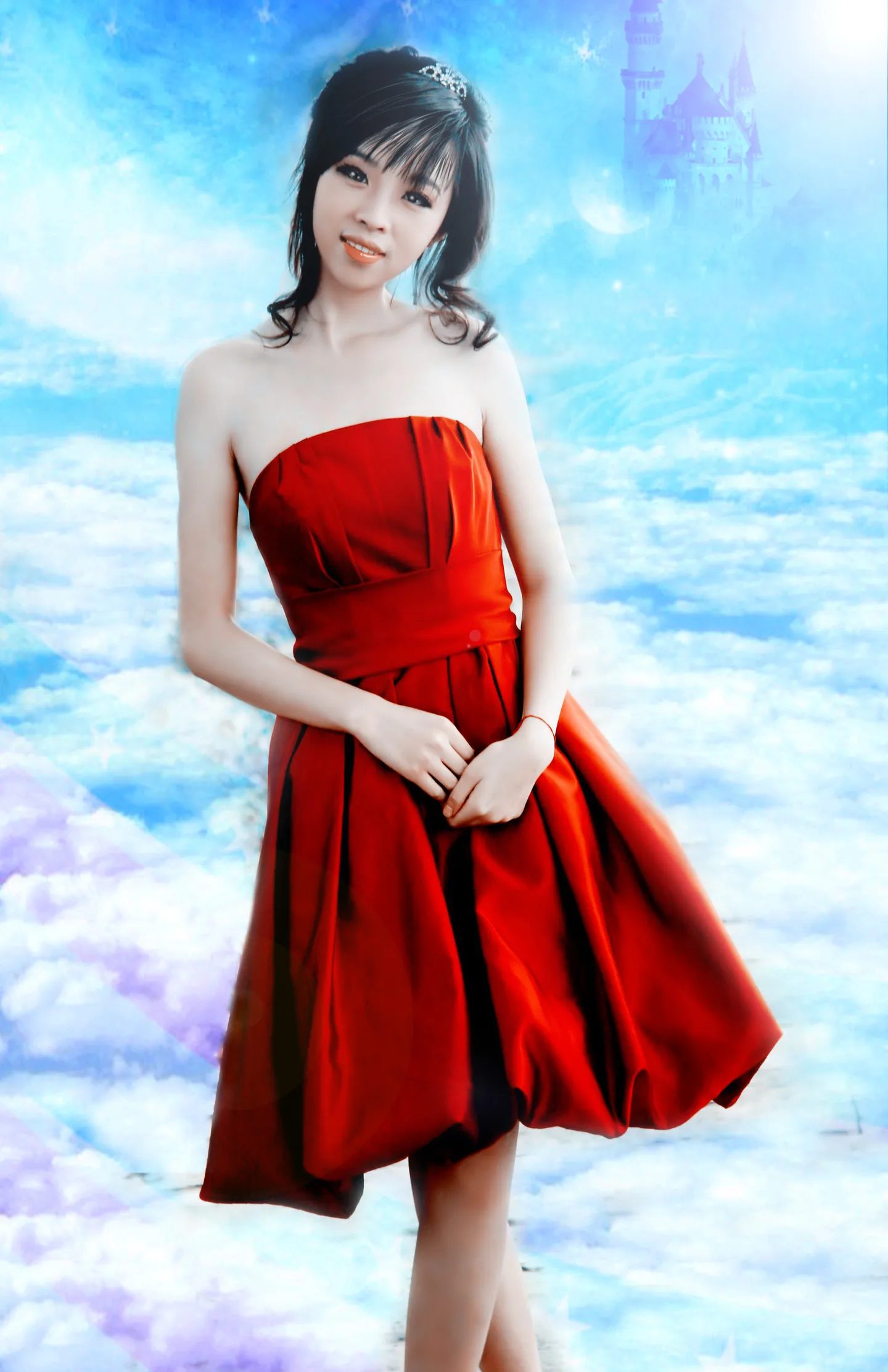 背景意境梦幻点嘴巴和牙齿希望帮我修下 眼睛再大点怎么好就怎样吧 额发帮忙处理下 腿部再修长点 用途:娱乐 艺术化:轻微艺术化
