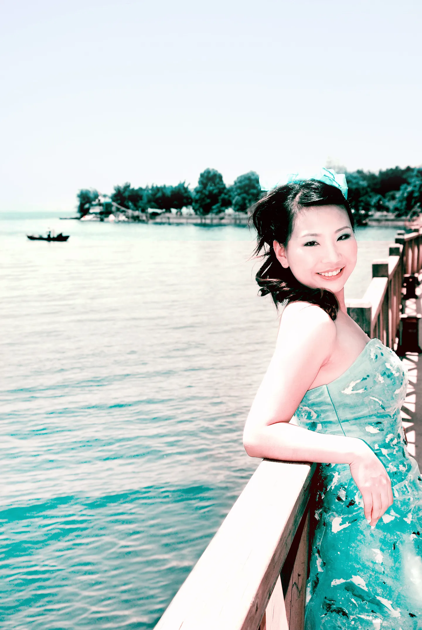 去影楼照像,给我的底片就是这个样的,他们给我做好的相片颜色真实自然,可是他们不给我做好的相片,我希望改这张图,蓝蓝的天,清清的水,后面的树更翠绿一点,衣服的颜色再鲜艳一点,背景就不改了,左下角水里好像还有点垃圾,照片尺寸也不要修改,人物保持最大的真实自然。