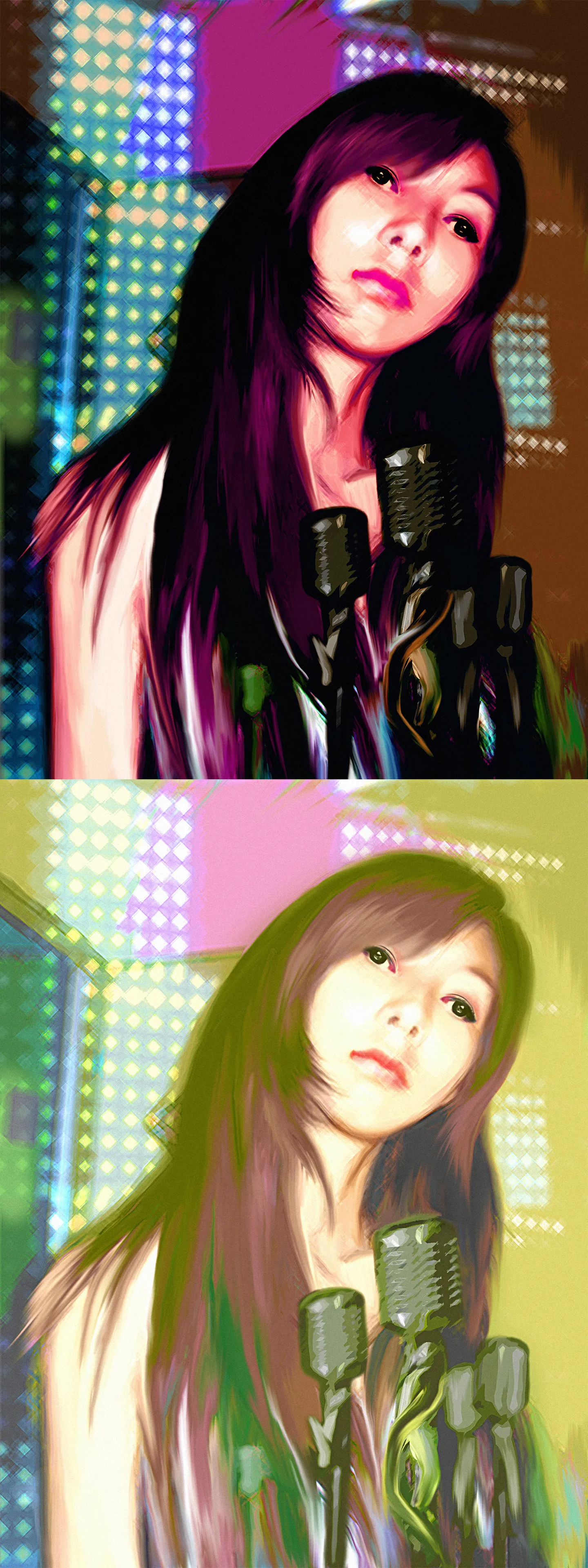 下面那个是开始做的颜色,后来叠加背后灯光层时颜色就变深了,索性调暗调一点,我想来想去还是蛮喜欢这个绿色就传上来