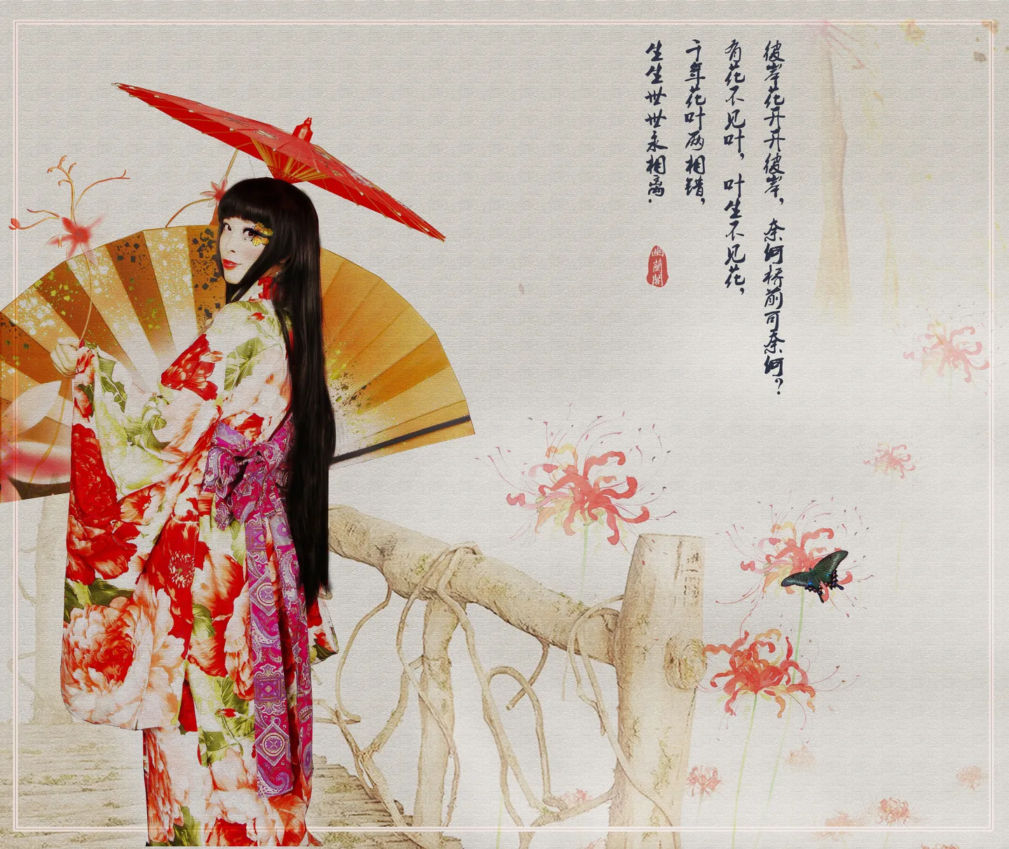 画卷一样超美!额角加了蝴蝶花钿好好看,手里还拽着一枝曼珠沙华……离一大人的合成图把细节处理得好赞~~满地打滚求大人帮忙修图啊 !!