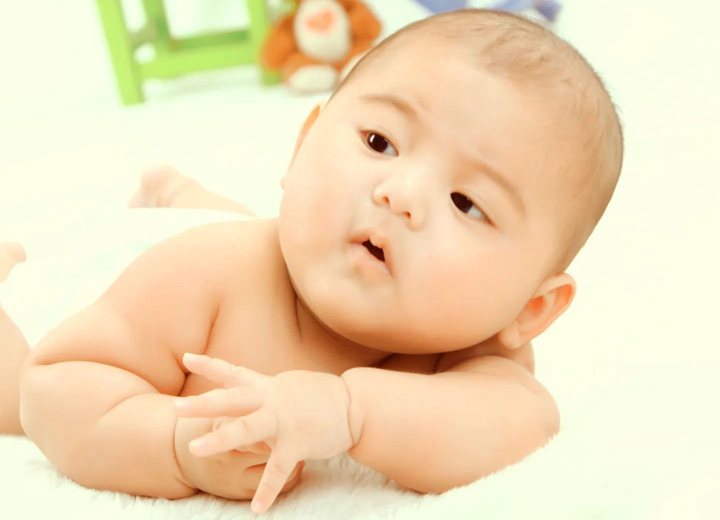 宝宝百天照。请您把斑点去掉、肤色调亮、皮肤干净透明、背景朦胧、突出主人公。 基调:欢悦明快的 艺术化:保持真实性 谢谢!