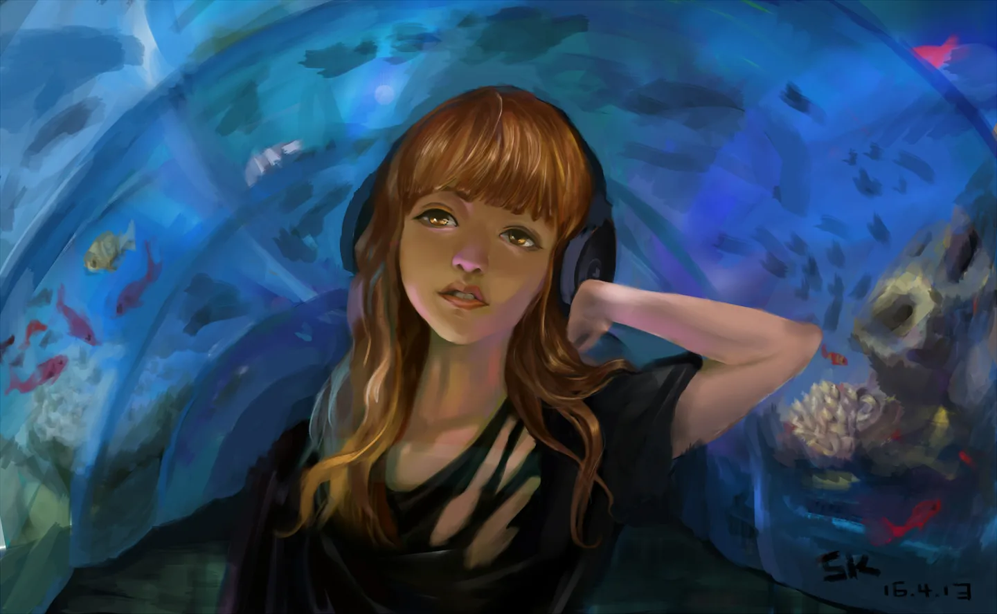 SK哈哈哈。不管画什么风格都好神似啊。这个背景是个环绕的海底世界,头顶上可以看到很多鱼在游来游去。好有童心啊!你男票也很...