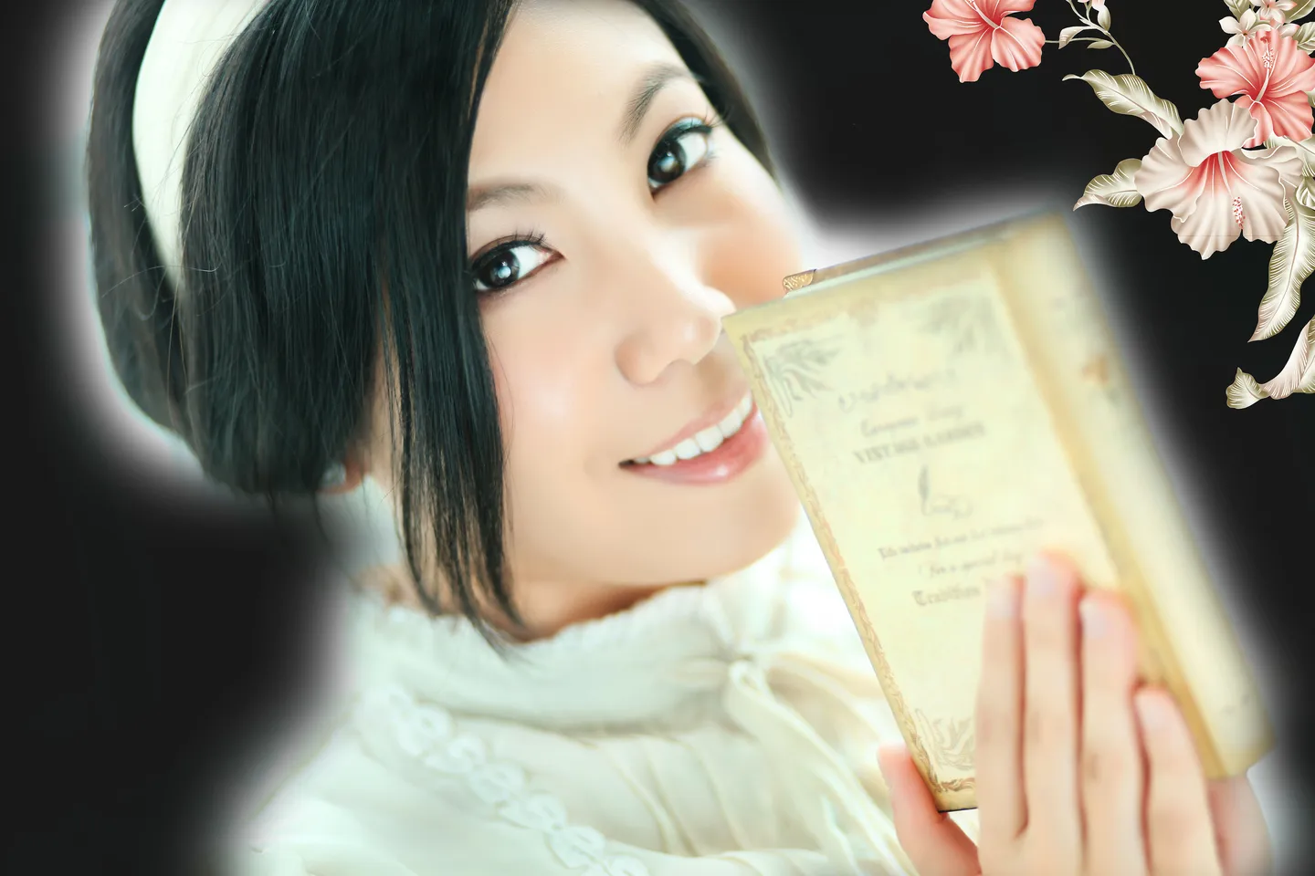 美化人物脸部,请把书本下方那个黑色的线线处理掉。希望是典雅唯美的基调。其实只要配合画面处理就可以,我相信设计师:)