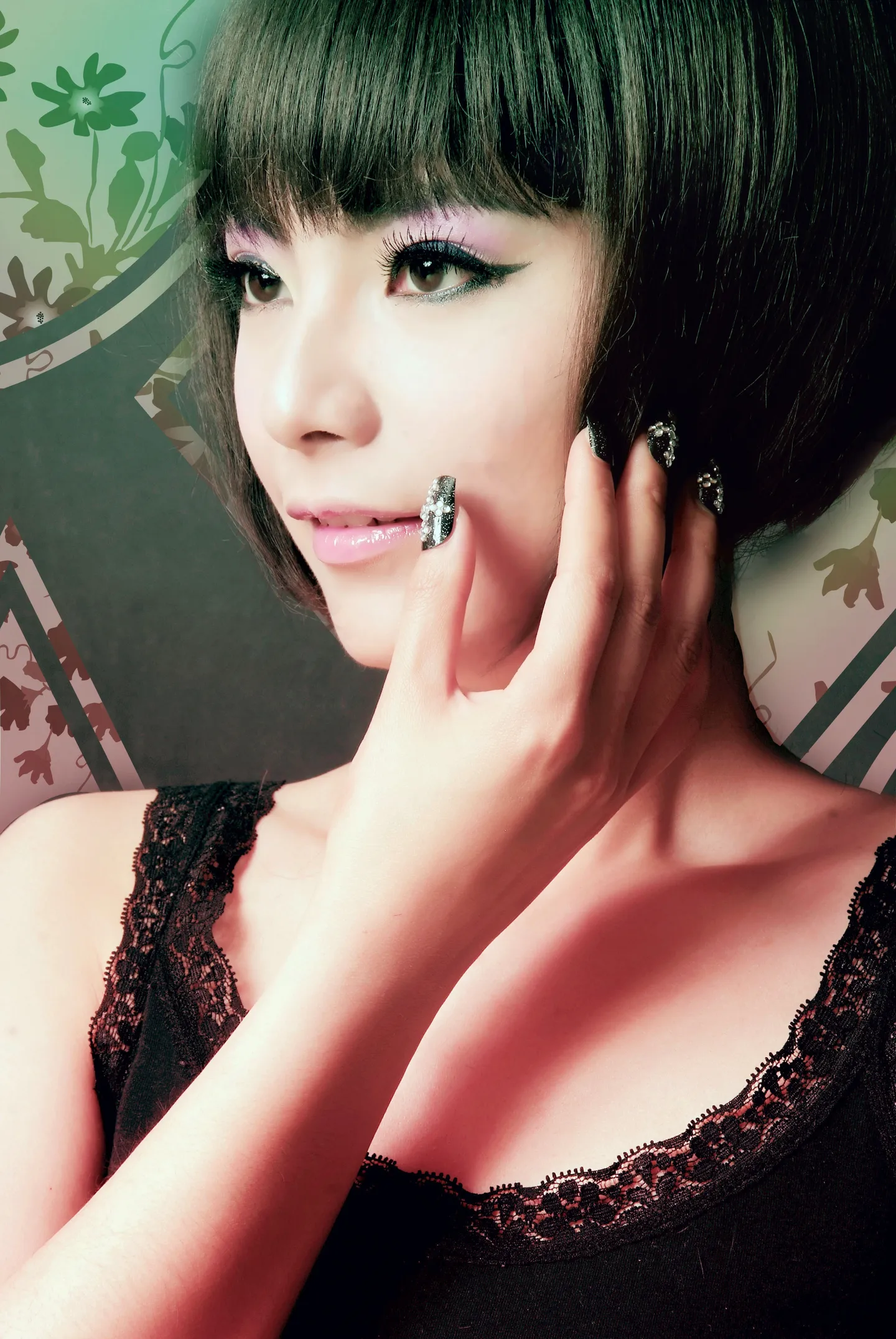 背景有点不搭调,主要是太突出了。和人物“一体化”了。偏红。眼影加的不错的说。愚见。可以不考虑。呵呵。