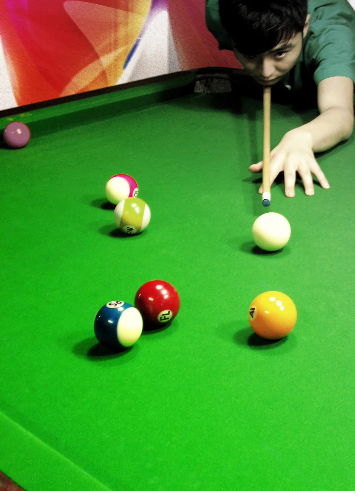 真实自然的照片效果(脸型不要液化)~台球桌后面换个背景~谢谢了~辛苦了~敬礼~