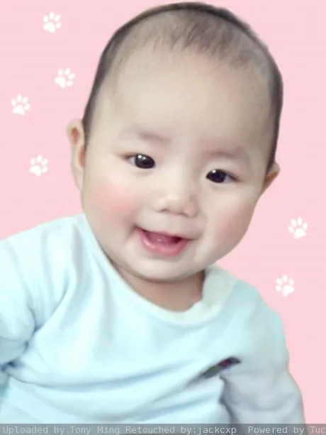高手们,请把背景去掉,换成能突出BB的背景,如风景之类,去掉BB脖子上的红绳,还有身上的手指。谢谢啦。