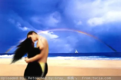 天空有彩虹,背景希望改成大海,有海浪.突出主人公.把包包去掉 .给人感觉温馨.其余的你看着办吧,