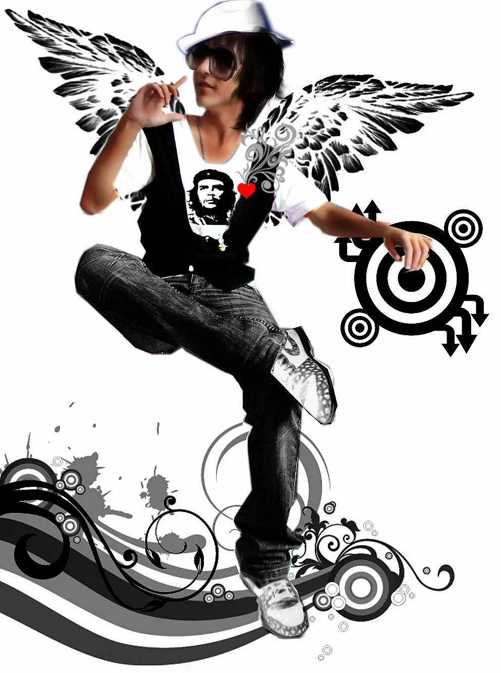 背景的桌子和门框显得有点乱,最好去掉,加个翅膀,最好是黑色的,但是修改后的北京不要太科幻或者虚幻,尽量接近现实。
