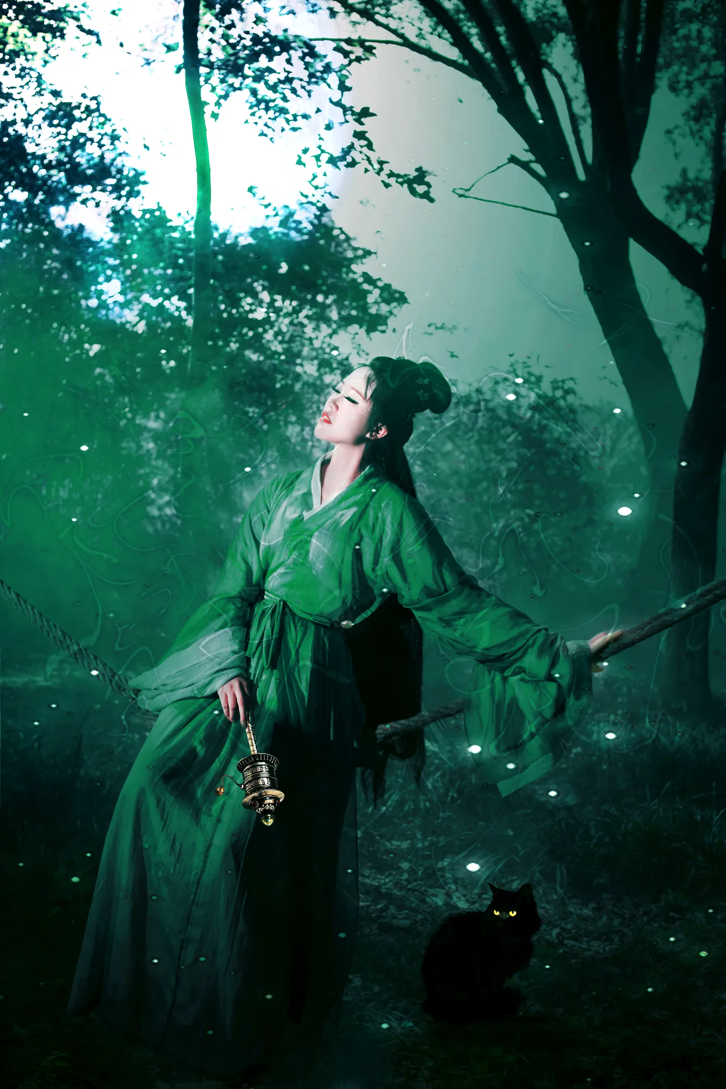 哇~森林里的绿色精灵啊!黑猫太萌了~~手上转经筒好特别