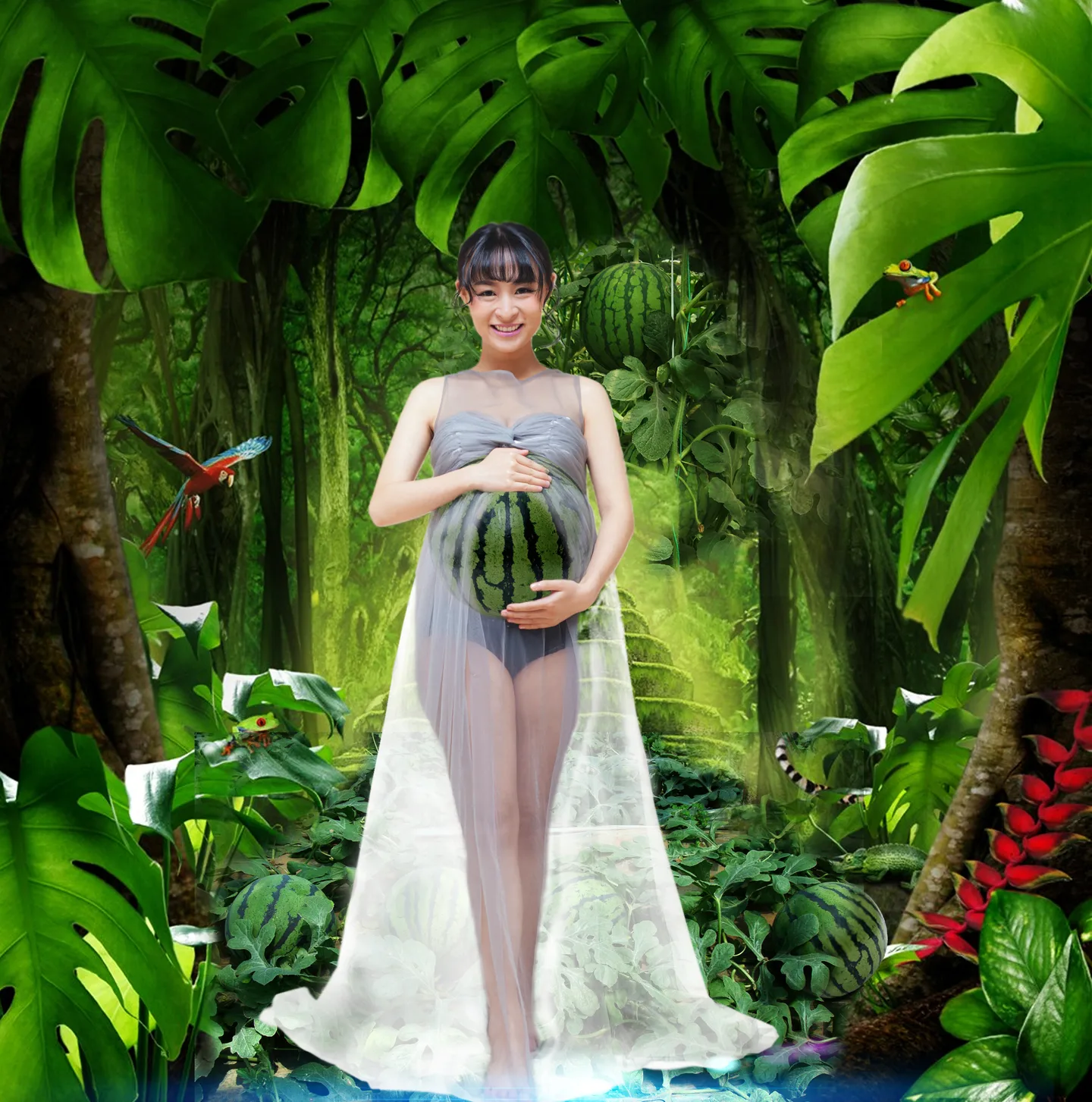 现在西瓜是像葡萄一样结在空中,问问度娘、她会告诉你。