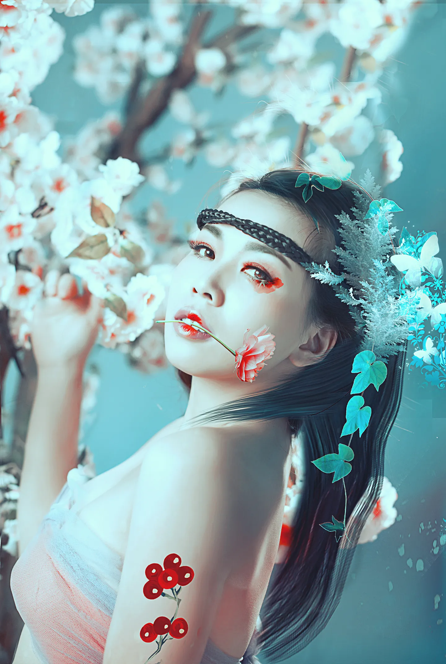 妆容和嘴里的花很棒!胳膊纹身感觉风格不太统一 (表情)