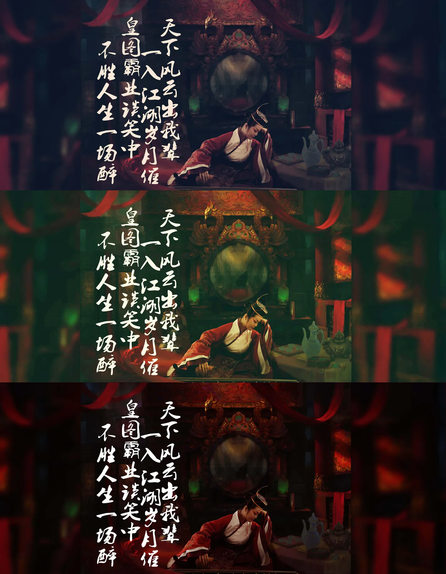 谢谢大神修的图!三个版本的色调都特别有意境,整张作品真是霸气侧漏!!小时候看完笑傲江湖之东方不败之后,对电影中的“皇图霸业谈笑中,不胜人生一场醉”这首诗是一直深爱到现在。一看到大神把这段诗句写在图上,我就忍不住勾起昔日情怀啊