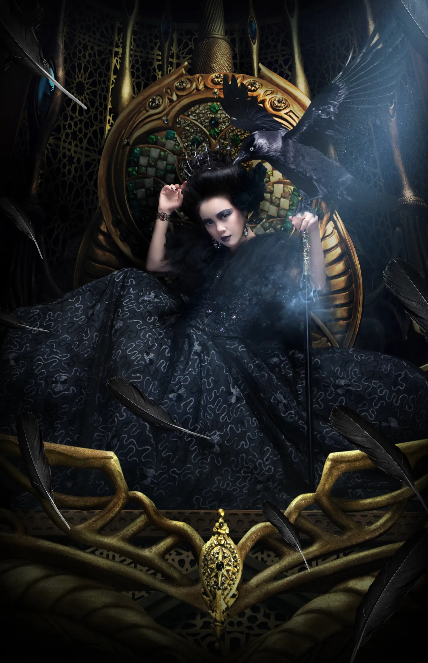 每一个细节都太精致啦,真是完美的合成大片!喜欢手上站着的振翅欲飞黑乌鸦,和周围飘散的羽毛烘托出人物更加阴森森的气场!喜欢头上的荆棘王冠,喜欢右手腕的镯子,喜欢发光的权杖~~还有还有,人物肌肤修得美哇~~
