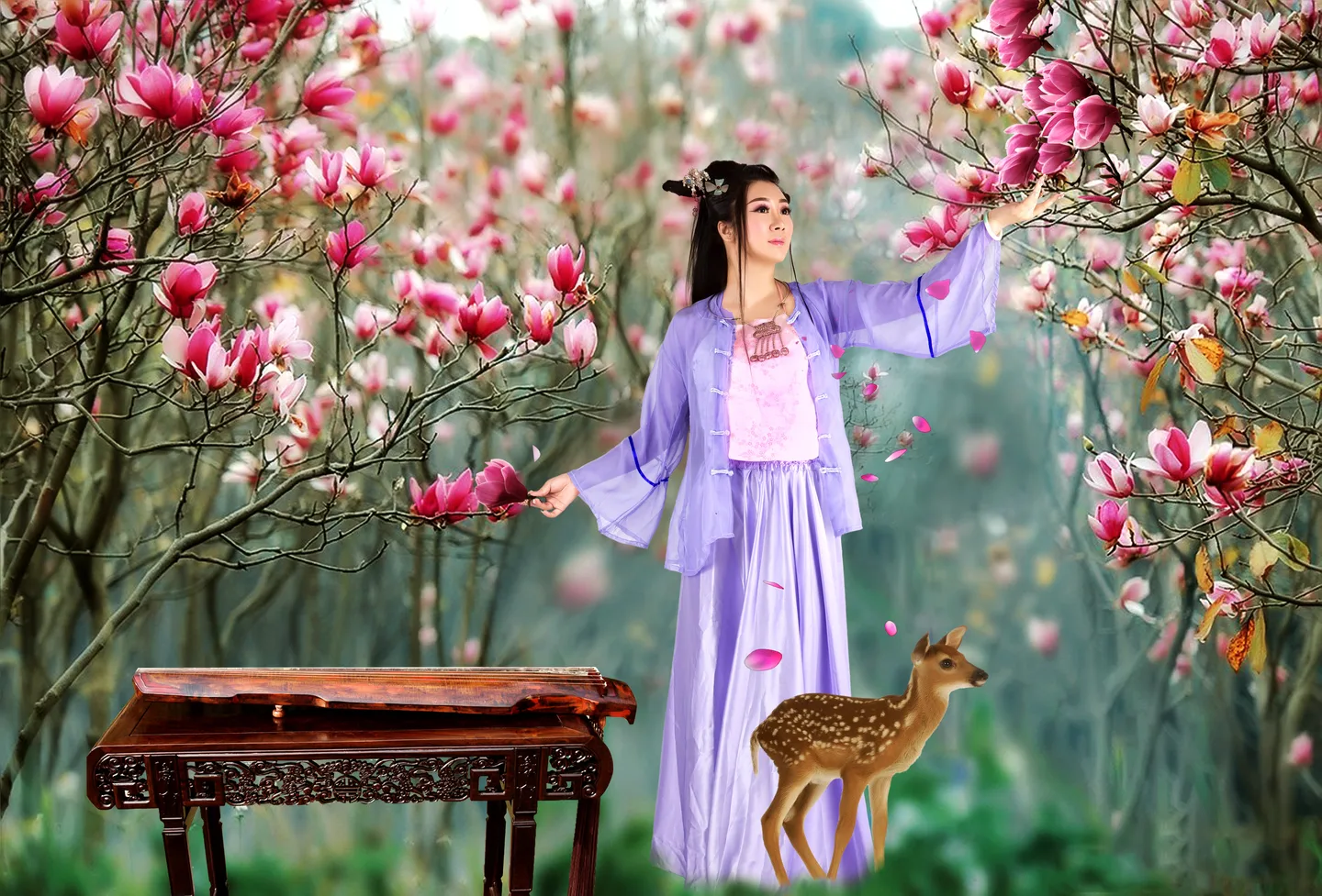 紫红玉兰林子太美丽!那只幼鹿萌萌哒。背景素材还有个人物啊,现在看这作品完全看不出来,不愧是辛苦花费时间慢慢擦去的,一点痕迹都没发现啊。玉兰花的高清素材好像真不容易找,我以前搜集各种花花高清背景图的时候搜过几个图片库,但是也没几张的样子~~