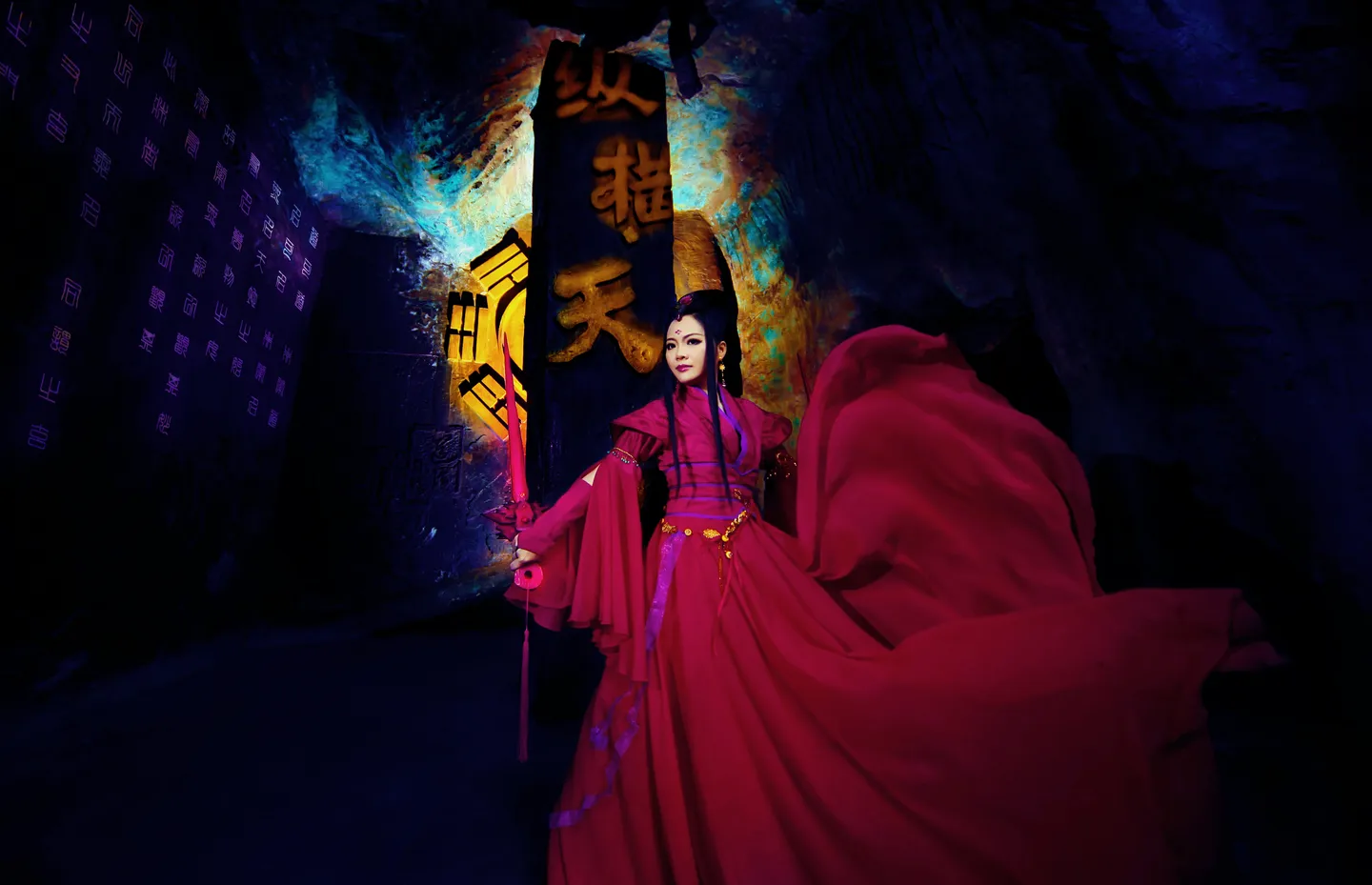 谢谢子南大人赐图。。。这张图真有气势,霸气侧漏!而且特别像是海报大片一样,背景色调变得华丽极了,纵横天下的柱子和石八卦都在发光的感觉,石壁上的篆体文书也很有画龙点睛的效果啊