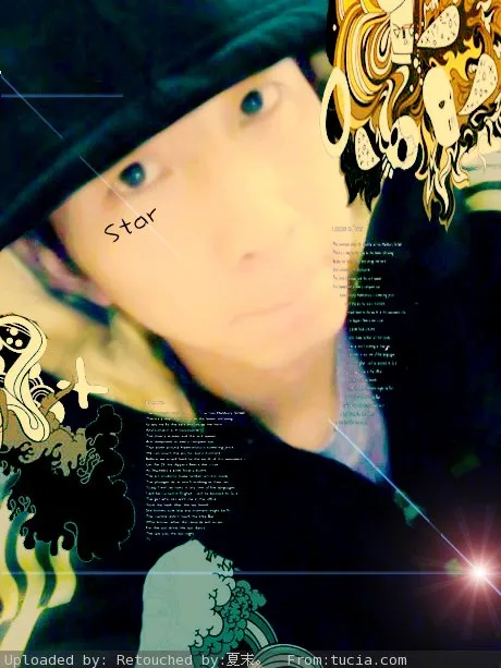 皮肤清除斑,再稍微调亮,换个好看的背景,非主流感觉,在左边脸上写一下(沈强↗Star)字体不要太大