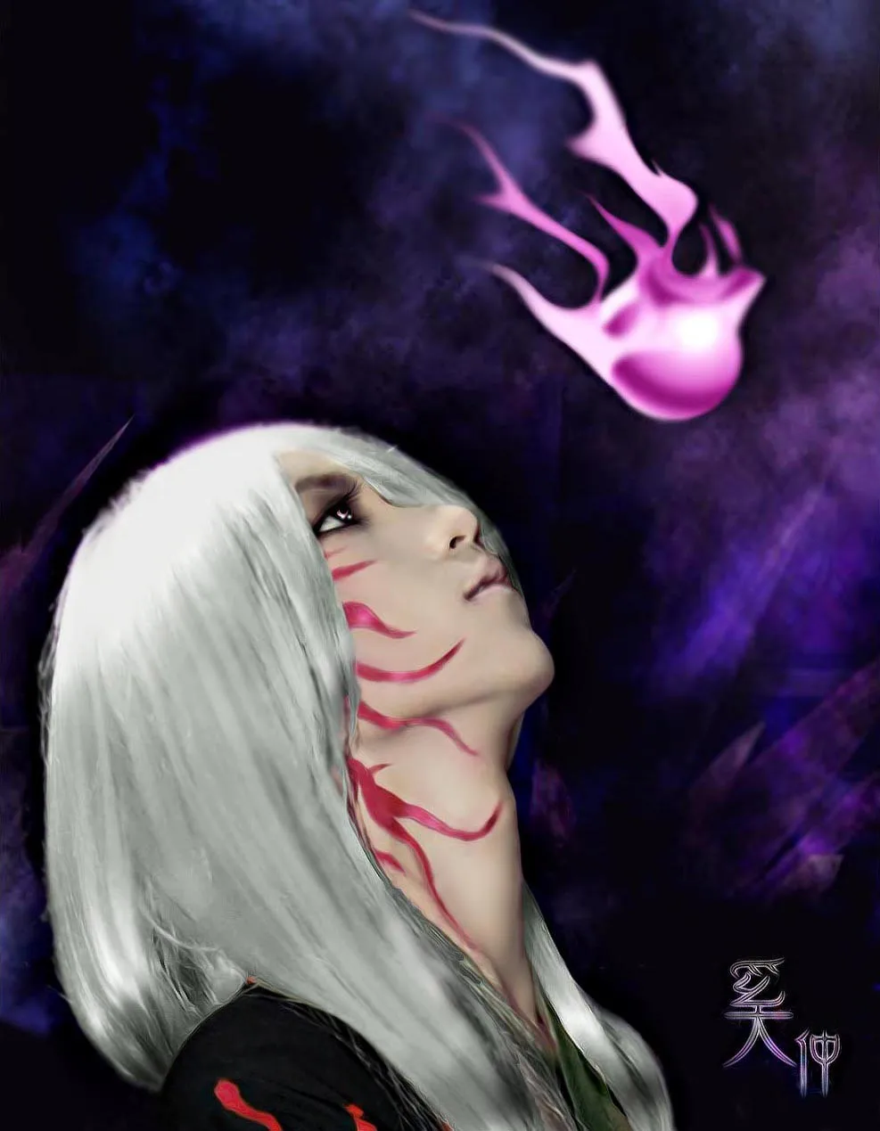 我的这个是cos的照片,原图人物是游戏仙剑奇侠传里面的奚仲,想要的效果:希望也能更加有点魔幻色彩,换个比较奇幻的背景,整体感觉希望是比较湛蓝,比较深邃魔幻,总之,请处理的越魔幻越好,谢谢