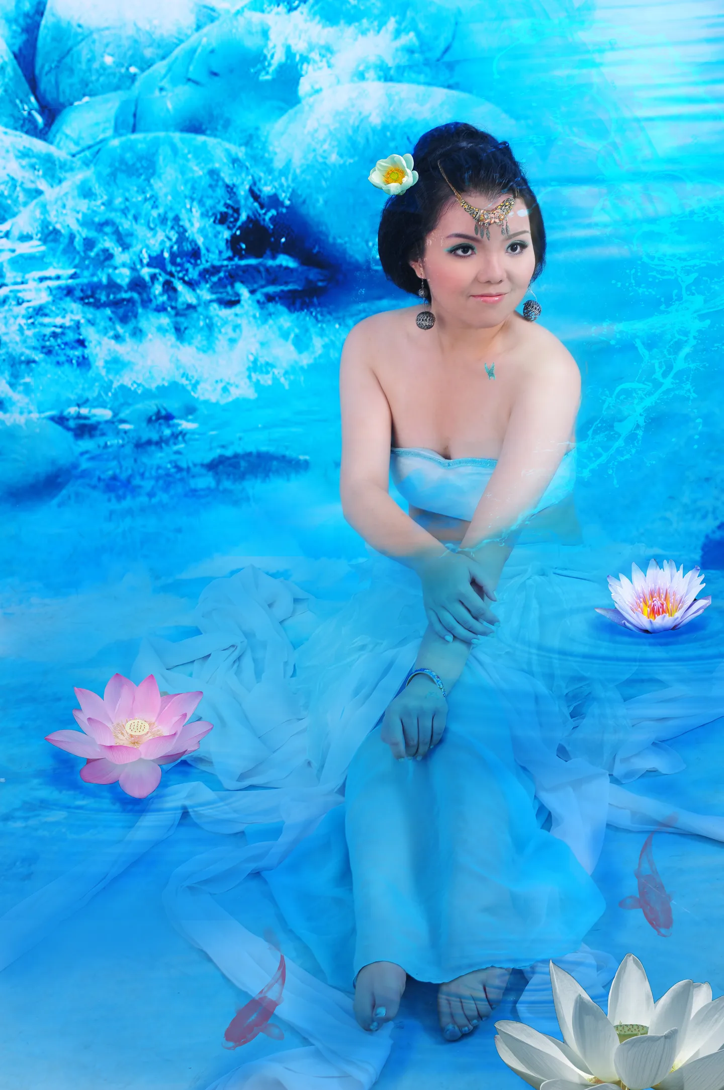 一个白荷花,一个粉荷花,一个莲花,头上再加一朵花~~好丰富啊~~