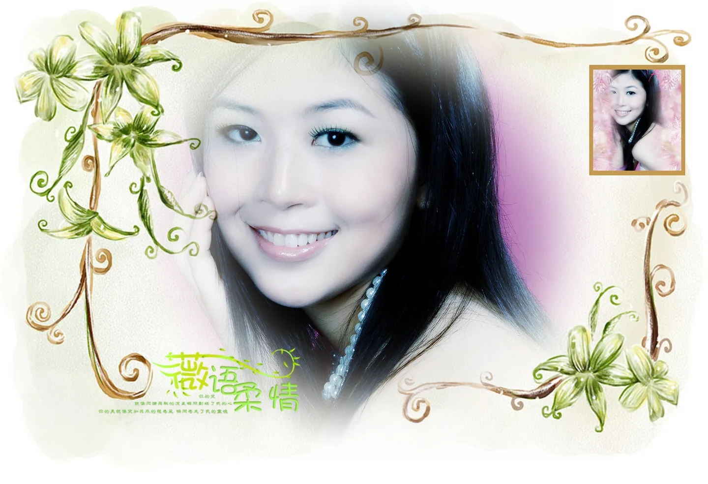 淡儿~~~~ 帮帮我吧~ 麻烦帮我把雀斑去掉, 牙齿上的唇彩清理掉, 右手的鼠标手痕迹去掉, 还有眼睛大一点自然一点均衡一点, 头发顺一点, 人瘦一点,特别是脸。 效果呢要有美感~封面一样的效果 朝着你的感觉设计下意境~谢谢哦~ 背景:朦胧化 基调:典雅唯美