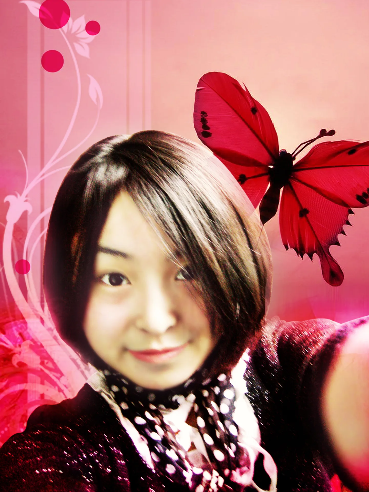 脸色看起来不太健康,请把我的脸色和皮肤调的自然一点,还有最好换一个好看的背景,我很喜欢你的粉涂鸦风格,让背景变的时尚一点吧,期待ing 背景:换背景 基调:欢悦明快的