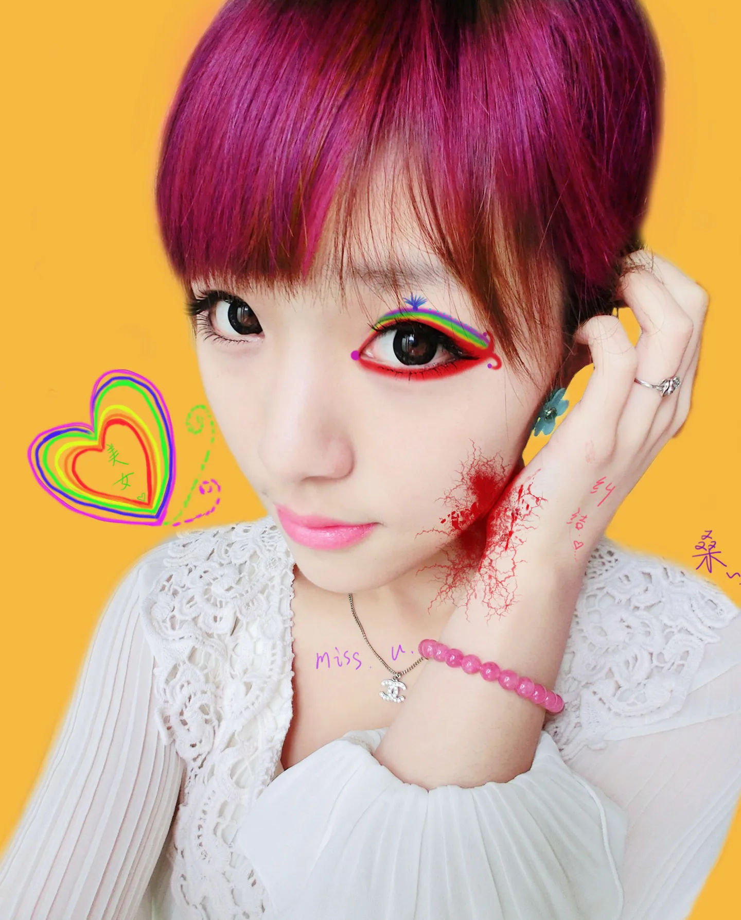 彩虹妆很好吖~但是手上和脸边的图案就有点不河蟹了~因为不是恐怖片儿~嘿嘿~