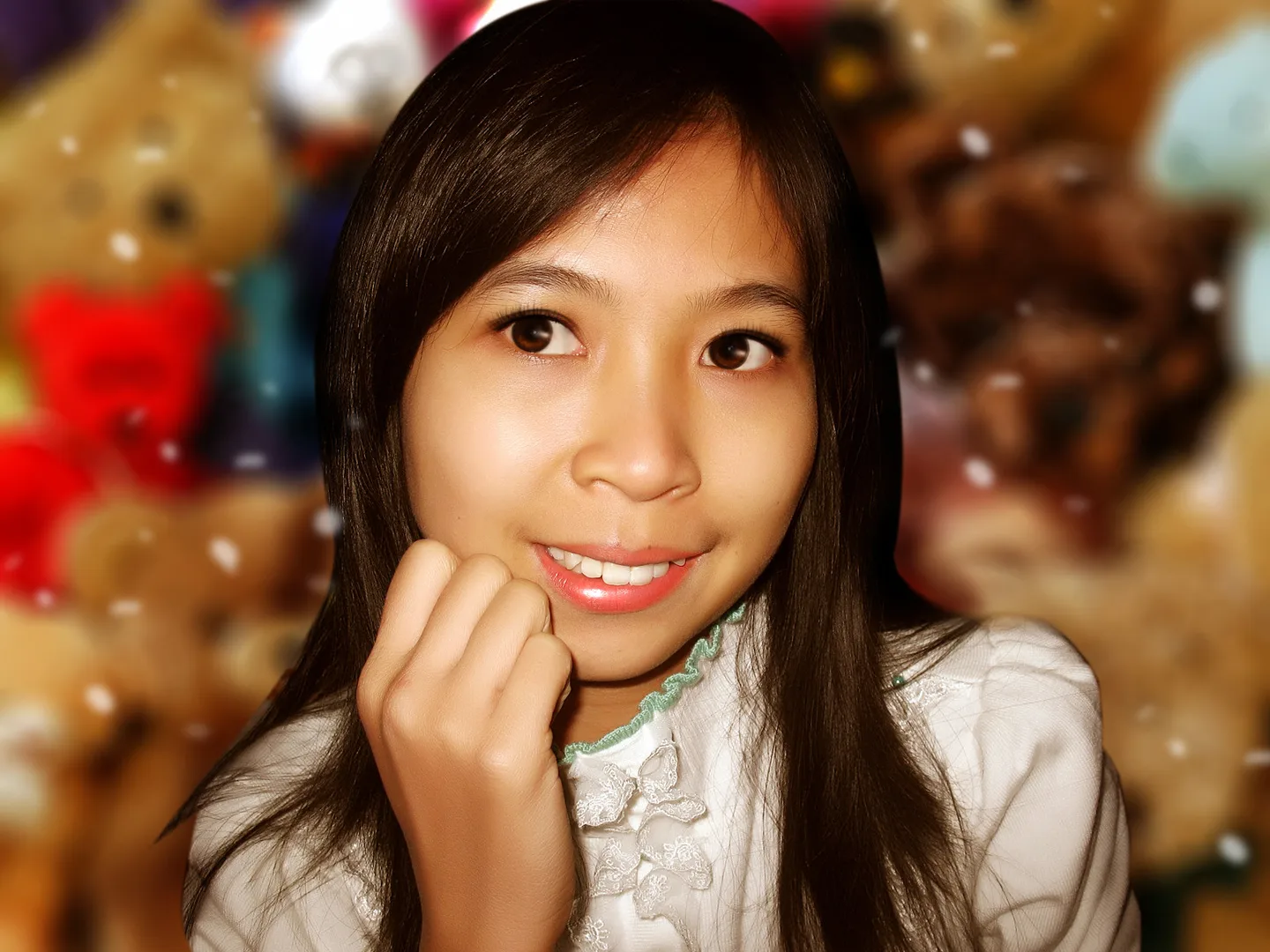美化一点我,换个背景行吗?我想要一个大公仔,谢谢 请不要刷我的图图。 用途:家庭纪念 基调:欢悦明快的 艺术化:轻微艺术化 背景:稍作调整