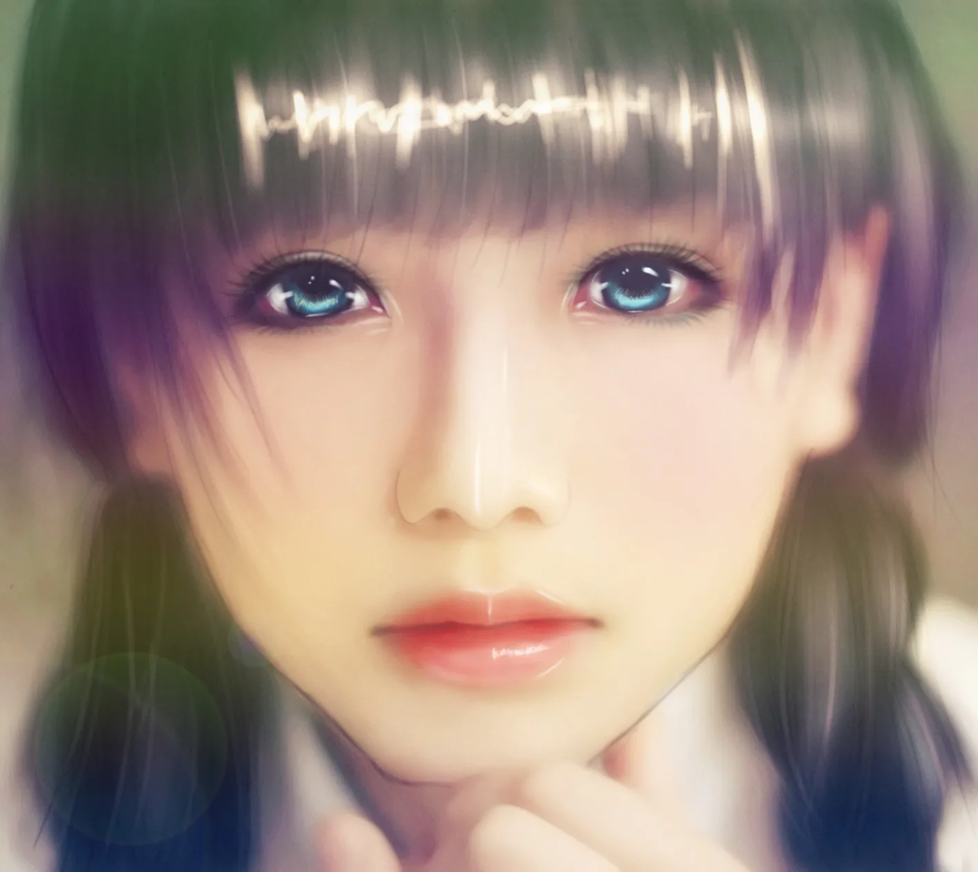 眼睛好美,刘海上的高光太夸张了吧。
