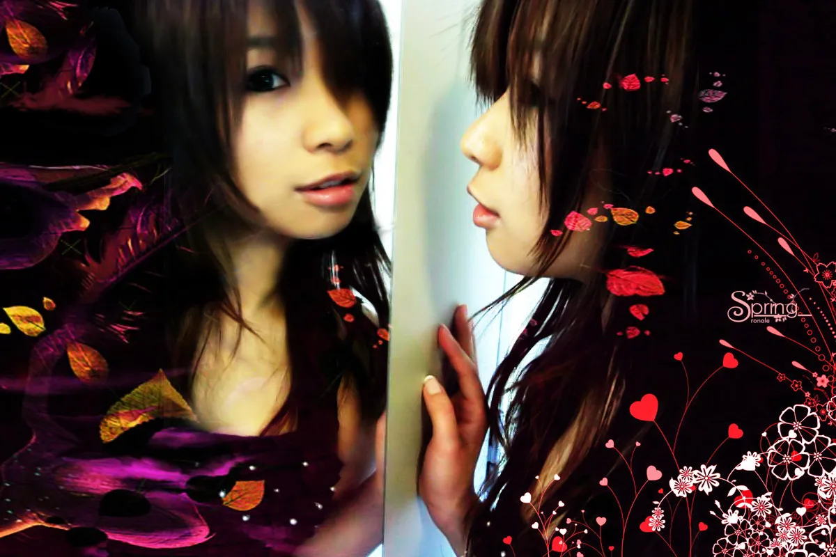 人物的外表不变, 能不能把镜子上的模糊处修正一下。或者用亮亮的小点点去盖住?在照片的左边能不能加朵玫瑰花然后花瓣飘到这个照片上?最后得到的照片比例为1280X800。 艺术化:保持真实性 用途:用做桌面 基调:典雅唯美 背景:稍作调整 (当中部分用原图)