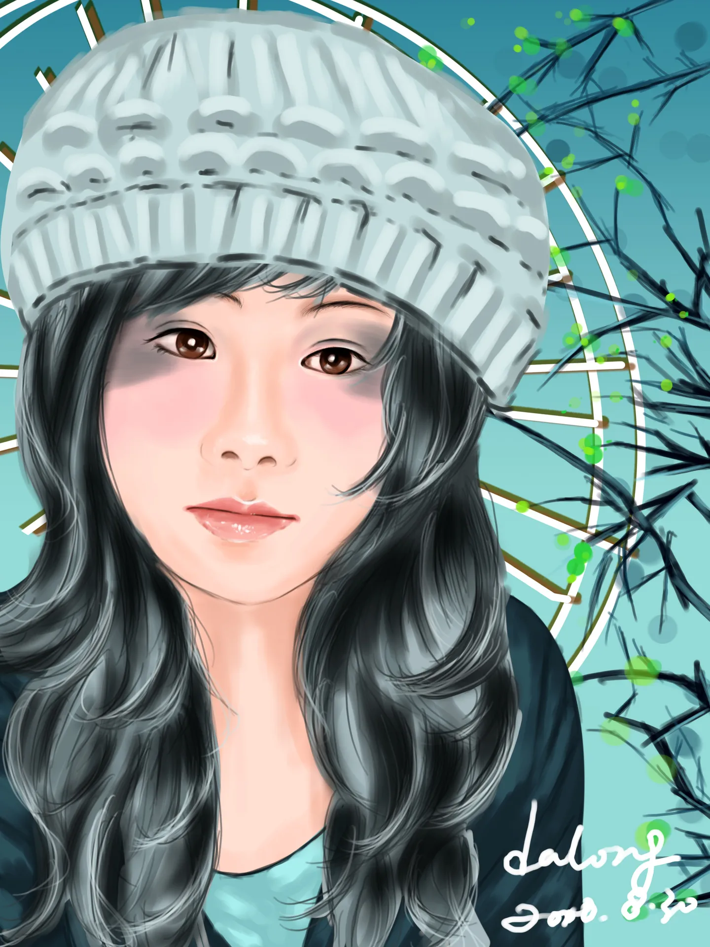 毛线帽子应该是贴着头发的,毛线帽的比例,过大了。脸上的熊猫眼有点影响美观。可以去掉,去掉会更完美,同样的问题,锁骨加强,不然上身显得很平面