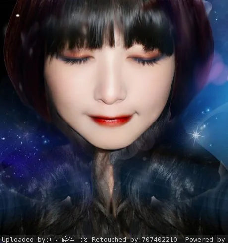 回到家里打开电脑一看,问题就全看出来了,加的素材上去也感觉是一块一块的,没有溶好.头发部分也处理的相当的不理想,暗暗!!!在那台电脑上这些问题就一点也看不出来,想再改的,可是发现已无从下手了,我哭!!!碎碎不好意思了,把你PP的相片弄成这样,