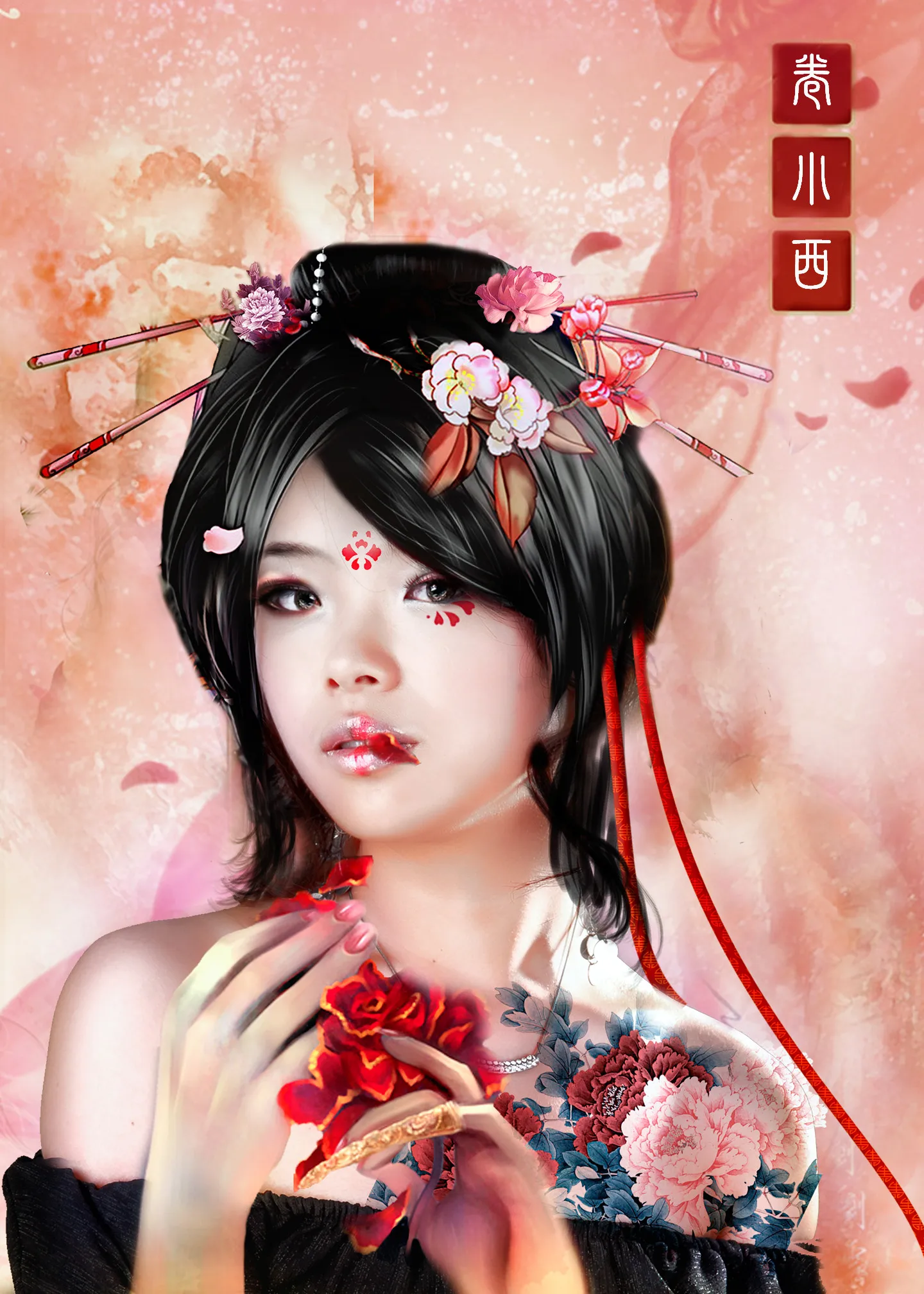 喜欢她肩膀上的那几朵牡丹。